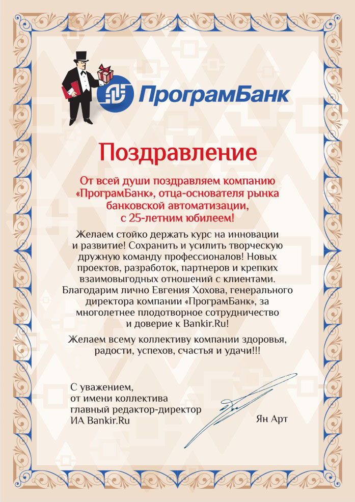 | От всей души поздравляем компанию «ПрограмБанк», отца-основателя рынка банковской автоматизации, с 25-летним юбилеем! Желаем стойко держать курс на инновации и развитие! Сохранить и усилить творческую дружную команду профессионалов! Новых проектов, разработок, партнеров и крепких взаимовыгодных отношений с клиентами. Благодарим лично Евгения Хохова, Генерального директора компании «ПрограмБанк», за многолетнее плодотворное сотрудничество и доверие к Bankir.Ru! Желаем всему коллективу компании здоровья, радости, успехов, счастья и удачи!!! С уважением, от имени коллектива Главный редактор-директор ИА Bankir.Ru Ян Арт | ||