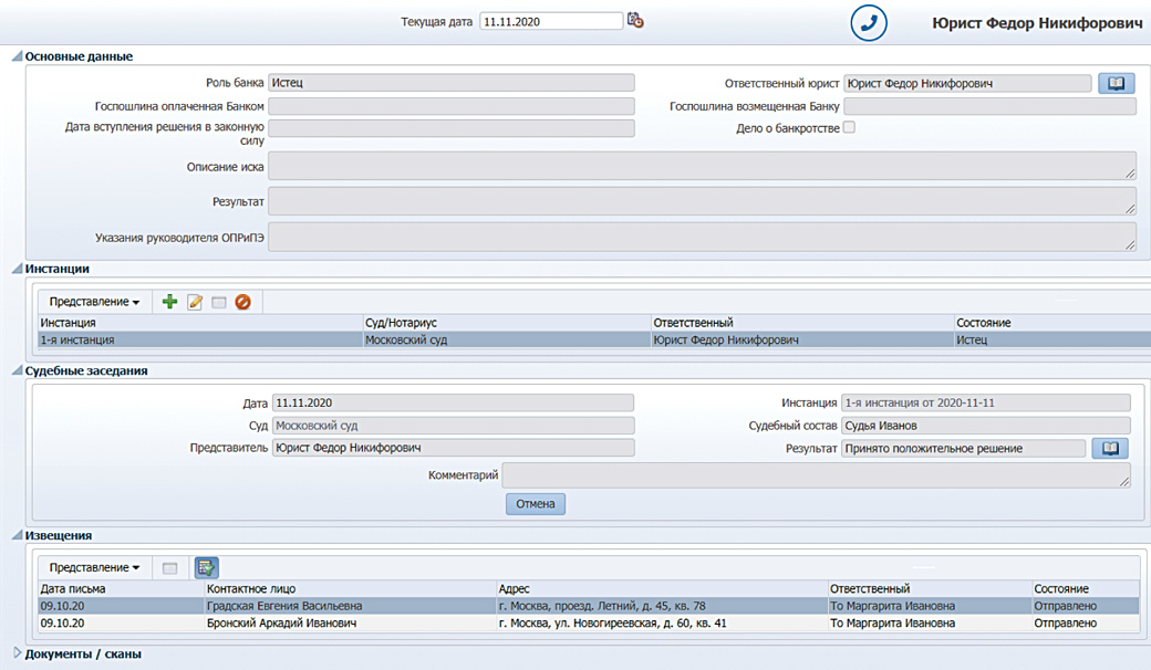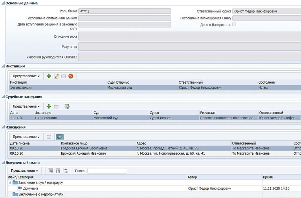 В «ПрограмБанк.Взыскание» ведется учет решений суда, мировых соглашений, судебных заседаний (если требуется). Судебная стадия, чаще всего, завершается учетом полученных исполнительных документов.