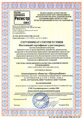 № СДС.ВСМ1.0230.СМК. от 14.11.2025 Срок действия с 14.11.2025 г. по 13.11.2028 г. СЕРТИФИКАТ СООТВЕТСТВИЯ Настоящий сертификат удостоверяет: система менеджмента качества применительно к проектированию, разработке, производству, внедрению и обслуживанию прикладных программных средств для решения организационно-экономических задач автоматизации управления производством, бухгалтерского учета и отчетности, делопроизводства, документооборота и управленческой деятельности, банковских и финансовых операций Система менеджмента качества соответствует требованиям ГОСТ Р ИСО 9001-2015 (ISO 9001:2015) Сертификат выдан: Акционерному обществу «ПрограмБанк» 111024, г. Москва, вн.тер.г. Муниципальный округ Лефортово, шоссе Энтузиастов, дом 5, стр.3 ОГРН: 1037722010336, ИНН: 7722283167, КПП: 772201001 |